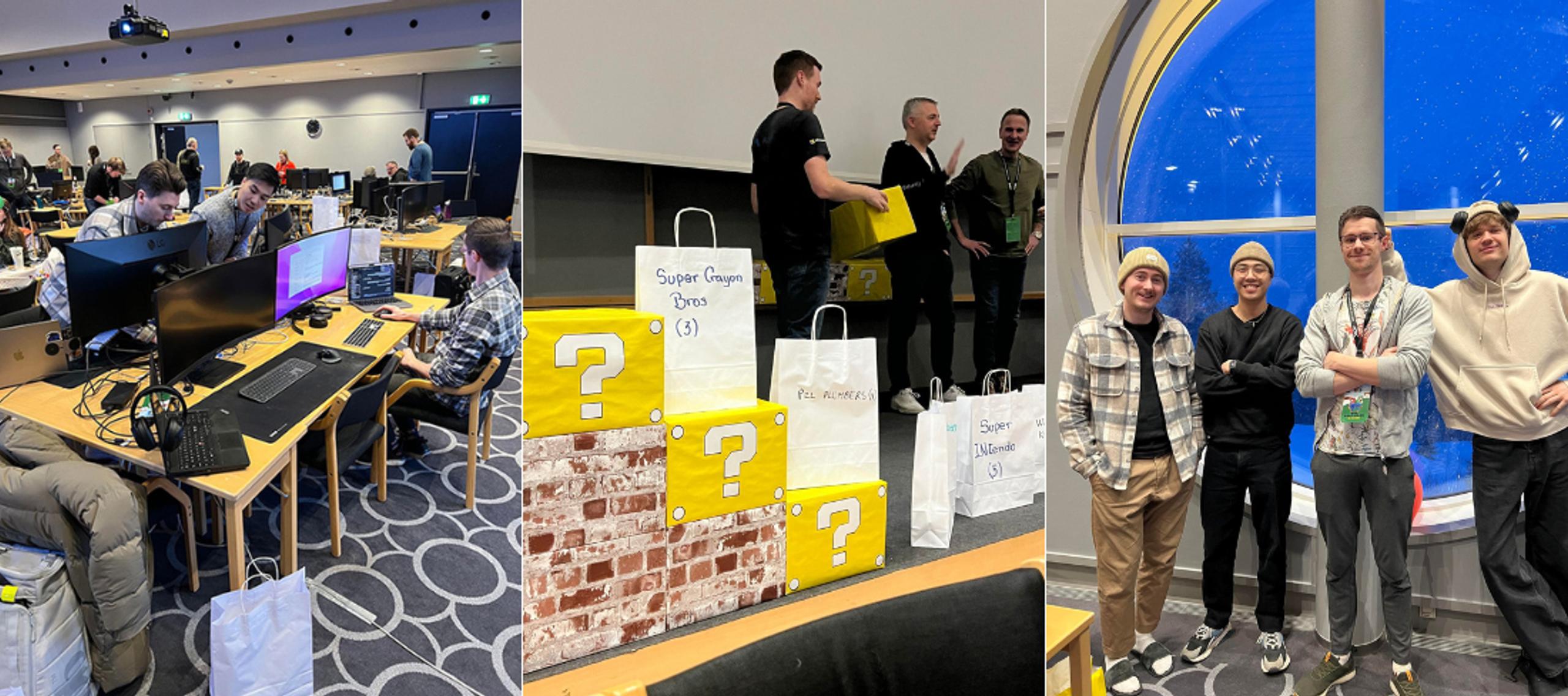 Fra venstre: Øistein, Tin og Remi rigger klar arbeidsplassen. Pallen som viser rangeringer med Super Mario-tema. Lagbilde med Øistein, Tin, Remi og Sindre, lagnavn "PzlPlumbers".