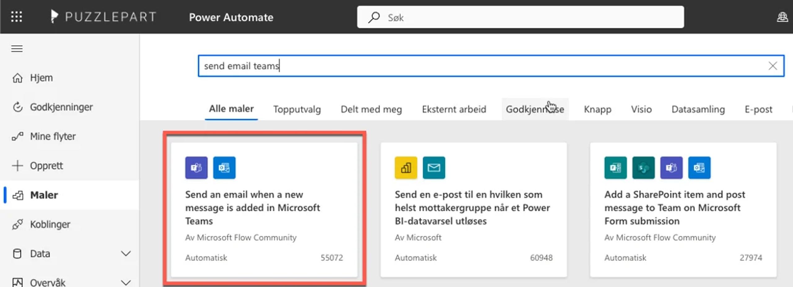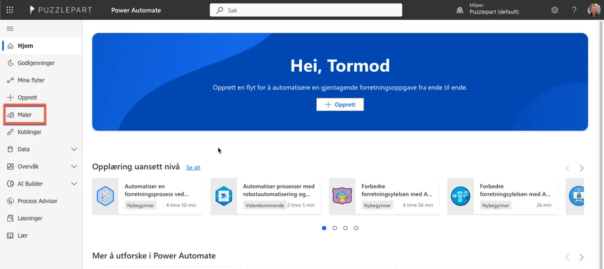 Det finnes et stort antall maler i Power Automate. Disse kan du åpne og se nærmere på – og du kan bruke dem som utgangspunkt for å lage egne arbeidsflyter.