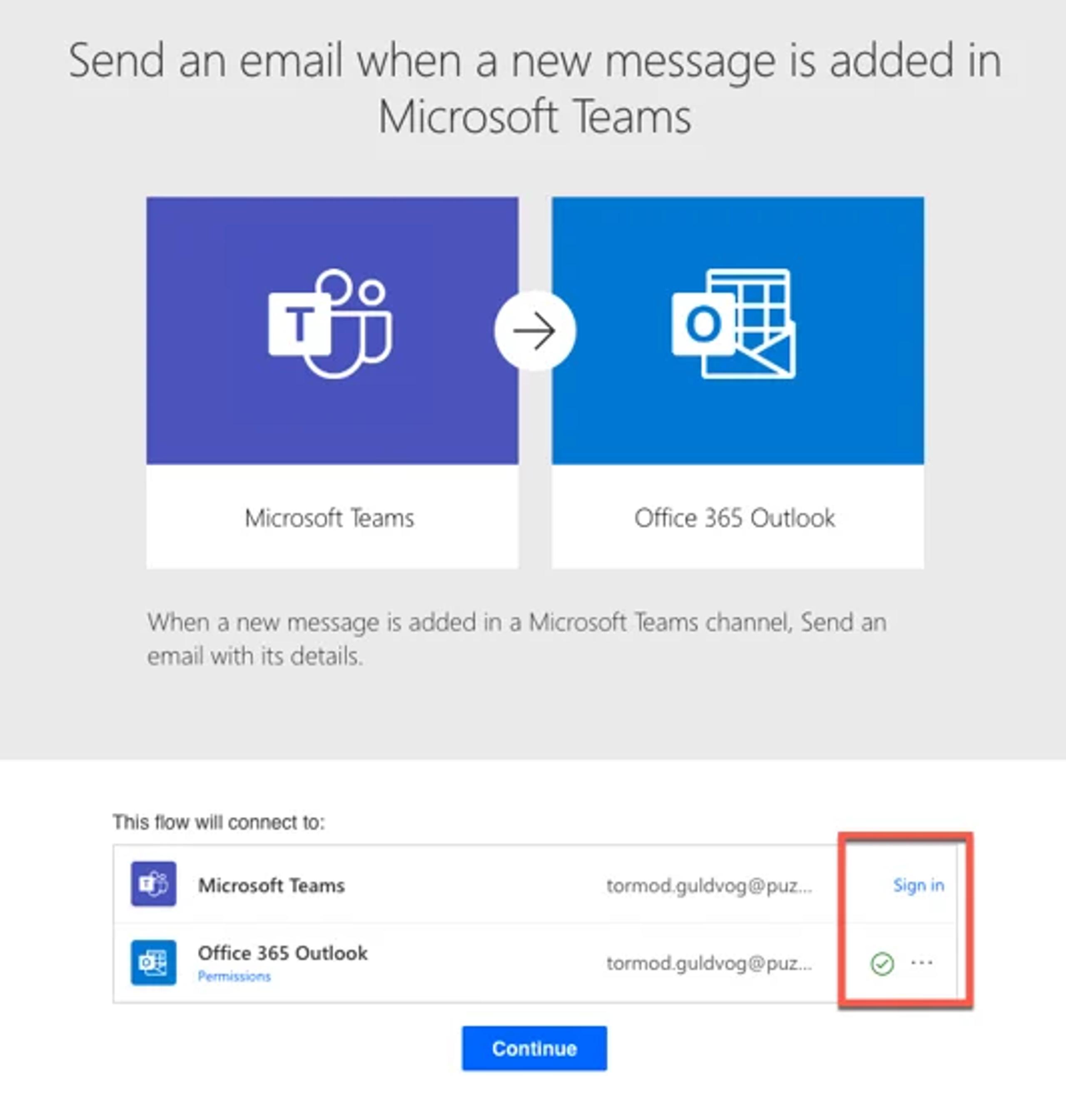 Litt lenger ned på siden ser du en liste over tilkoblinger som flyten trenger. I eksempelet ser du at det står «sign in» ved siden av Teams. Klikk på «sign in» så skjer innloggingen bak kulissene.