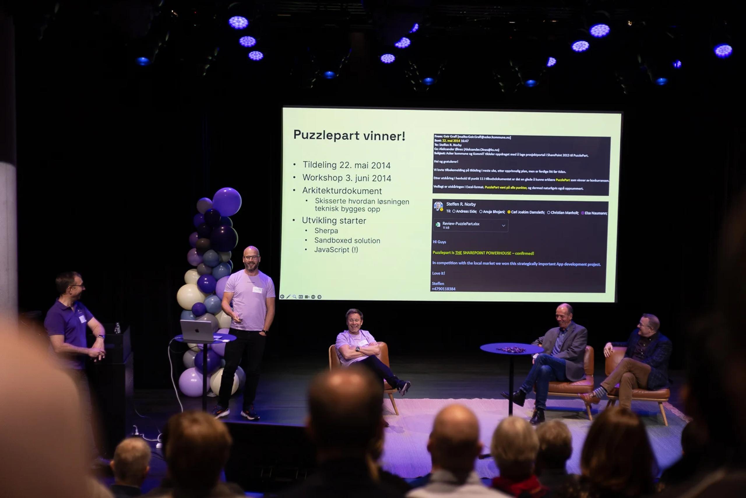 Fra venstre: Jan Lindset (produktdirektør i Puzzlepart), Tarjei Ormestøyl (COO i Puzzlepart), Steffen Norby (daglig leder i Puzzlepart) Jens Nørve (avdelingsdirektør i Digitaliseringsdirektoratet) og Geir Graff (innovasjonsstrateg og porteføljeleder i Asker kommune), på scenen under 10-årsfeiringen av Prosjektportalen. Tarjei forteller om Puzzleparts rolle i utviklingen og forvaltning av Prosjektportalen. Foto: Sarah Hansen / Puzzlepart AS.