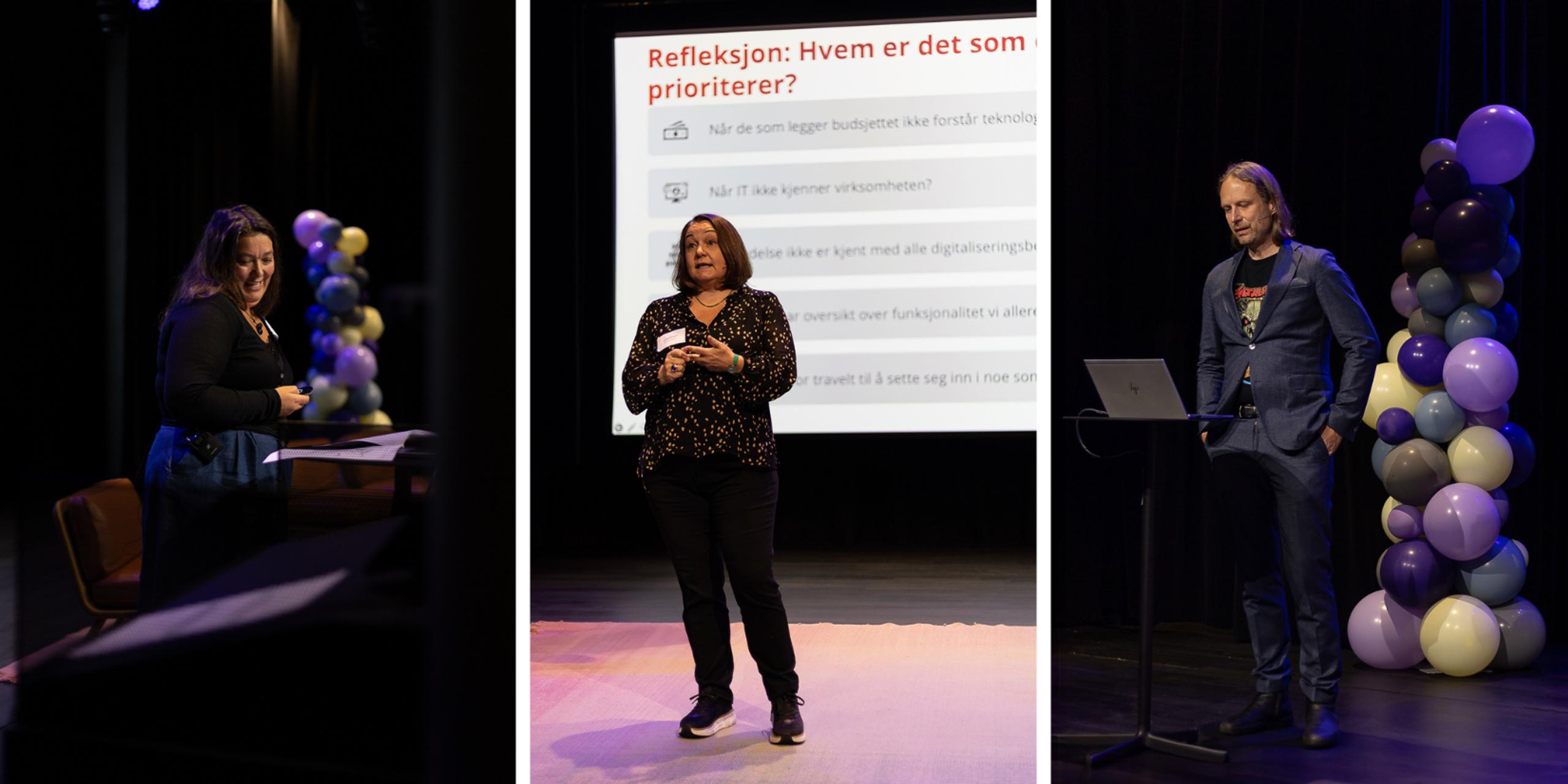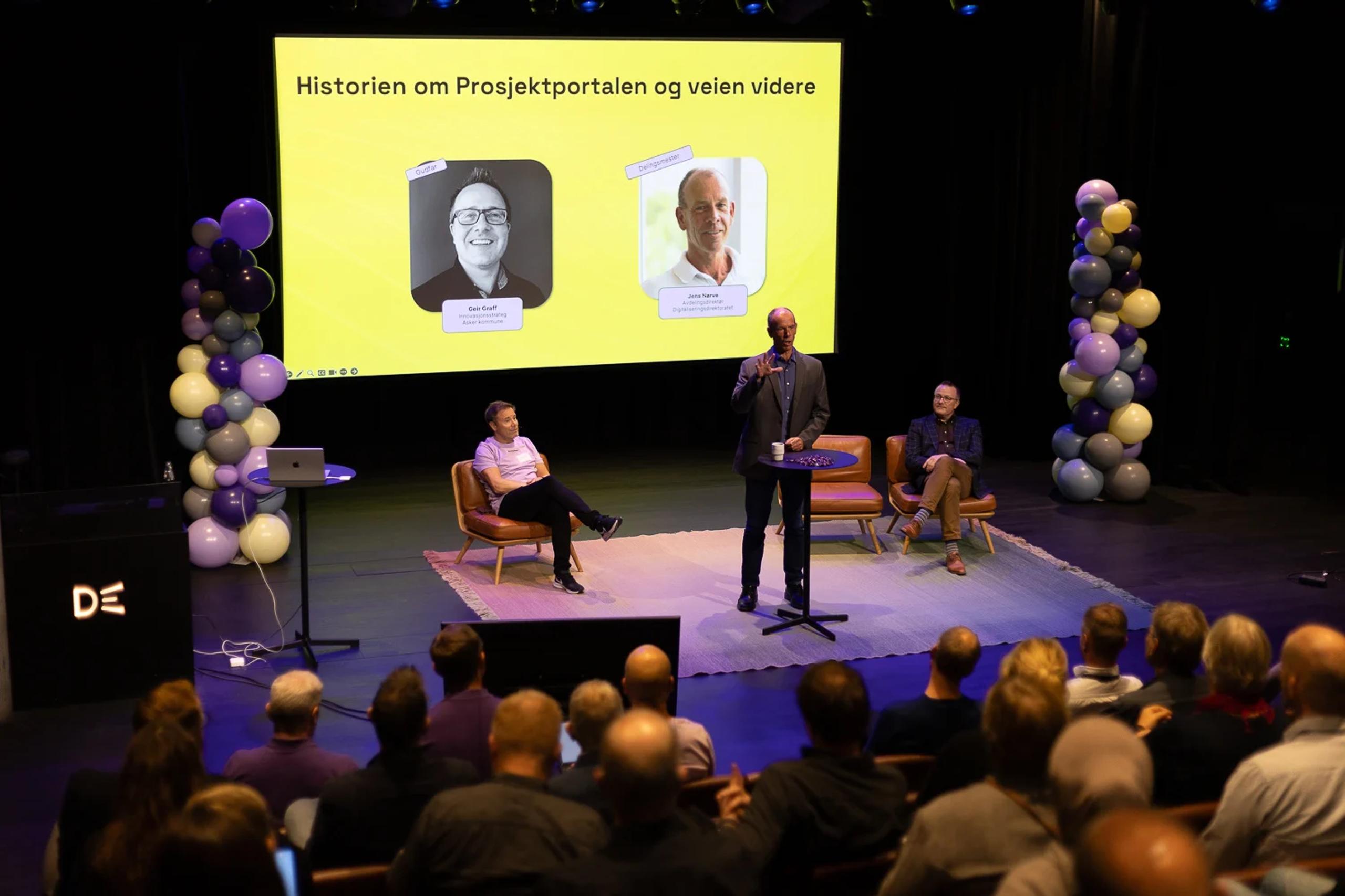 DET VAR EN GANG: Fra venstre: Steffen Norby (daglig leder i Puzzlepart) Jens Nørve (avdelingsdirektør i Digitaliseringsdirektoratet) og Geir Graff (innovasjonsstrateg og porteføljeleder i Asker kommune), på scenen under 10-årsfeiringen av Prosjektportalen. Sammen delte de historien om Prosjektportalen og dets betydning for offentlig sektor. Foto: Sarah Hansen / Puzzlepart AS.