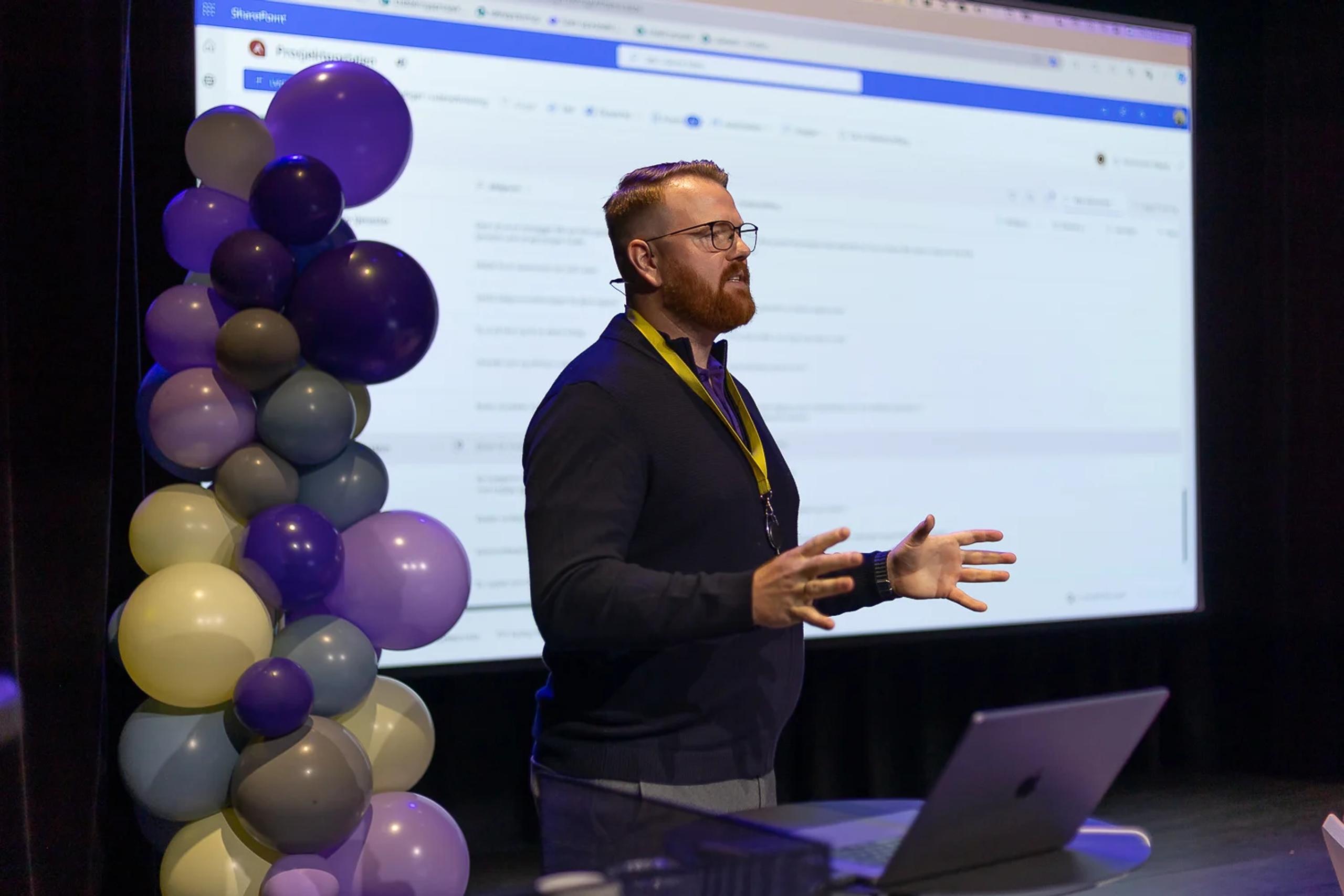 EN ENGASJERENDE WORKSHOPLEDER: Daniel Wiese-Møller, salgsdirektør i Puzzlepart, holder inspirasjonsworkshop om Prosjektportalen, under 10-årsfeiringen på Deichman Bjørvika 10. oktober 2024. Foto: Sarah Hansen / Puzzlepart AS.