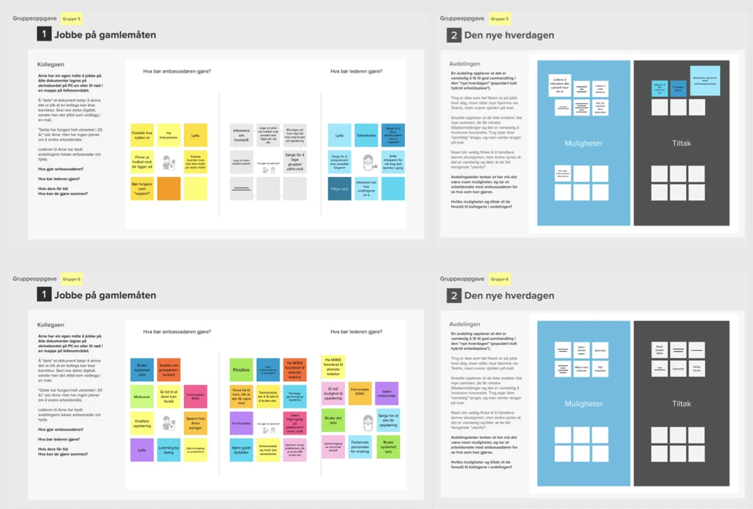Vi jobbet mye i grupper. Til dette brukte vi et verktøy som heter Mural. Det er en online-tjeneste som fungerer som «tavle» der alle deltakerne jobber på samme arbeidsflate. Mural gjør det mulig for deltakerne å sitte i grupper med en eller flere PC-er og jobbe sammen på oppgaver, uten at vi trenger «fysiske» verktøy som tavle, papir, tusjer og gule lapper.